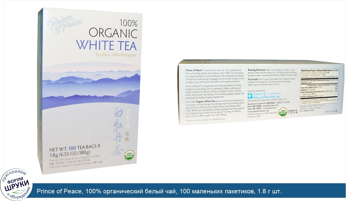 [DESCRIPT]Individually Wrapped. USDA Organic. Certified Organic by IMO Switzerland. Prince of Peace® is a brand you can trust. Our company has been providing quality tea products since 1983. Our tea leaves are organically grown and certified by IMO Switzerland. Instead of expensive advertising campaigns, we've chosen to pass on the savings on to you, and let you tell others of our great products. Our 100% Organic White Tea leaves and buds are picked at a young age, and go through the Zhenge-style of processing which gives the tea a richer aroma, a fuller body, and a deeper dark color. White tea's antioxidant content is greater than that of green tea. A typical cup of white tea has about 10-20 mg of caffeine, and a cup of coffee ranges from 100-180 mg.[/DESCRIPT]... (описание дополняется)