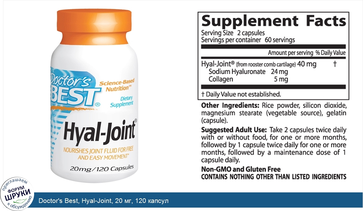 Друзья, если у вас есть отзыв/дополнение/комментарий/вопрос относительно Doctor's Best, Hyal-Joint, 20 мг, 120 капсул - напишите его ответом в эту тему (это будет полезно всему сообществу в целом и вам в отдельности).