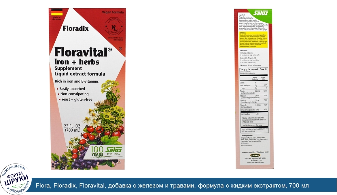 Друзья, если у вас есть отзыв/дополнение/комментарий/вопрос относительно Flora, Floradix, Floravital, добавка с железом и травами, формула с жидким экстрактом, 700 мл (23 жидких унции) - напишите его ответом в эту тему (это будет полезно всему сообществу в целом и вам в отдельности).