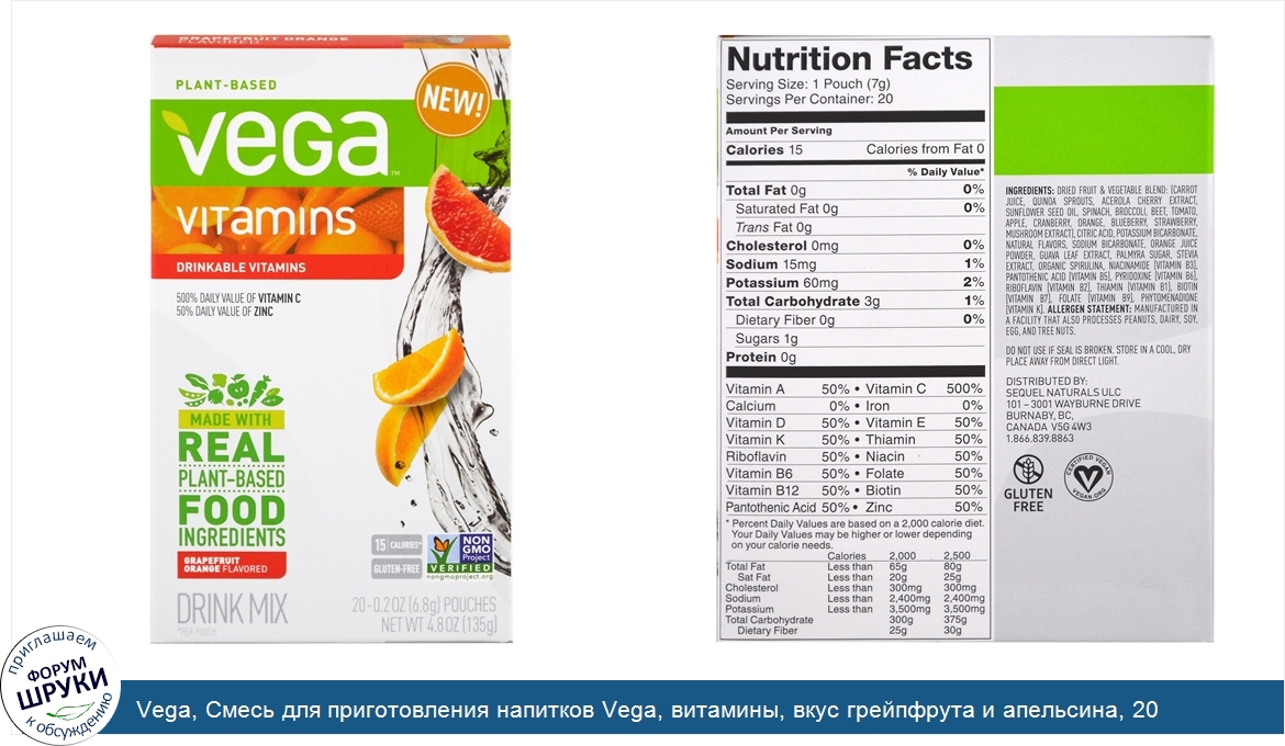 Друзья, если у вас есть отзыв/дополнение/комментарий/вопрос относительно Vega, Смесь для приготовления напитков Vega, витамины, вкус грейпфрута и апельсина, 20 пакетиков, по 0,2 унции (6,8 g) каждый - напишите его ответом в эту тему (это будет полезно всему сообществу в целом и вам в отдельности).