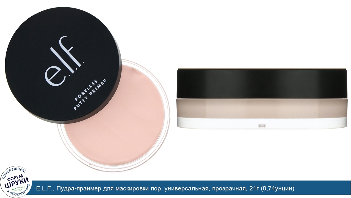 Друзья, если у вас есть отзыв/дополнение/комментарий/вопрос относительно E.L.F., Пудра-праймер для маскировки пор, универсальная, прозрачная, 21г (0,74унции) - напишите его ответом в эту тему (это будет полезно всему сообществу в целом и вам в отдельности).