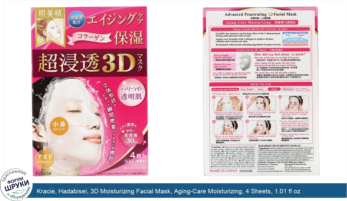 Друзья, если у вас есть отзыв/дополнение/комментарий/вопрос относительно Kracie, Hadabisei, 3D Moisturizing Facial Mask, Aging-Care Moisturizing, 4 Sheets, 1.01 fl oz (30 ml) Each - напишите его ответом в эту тему (это будет полезно всему сообществу в целом и вам в отдельности).