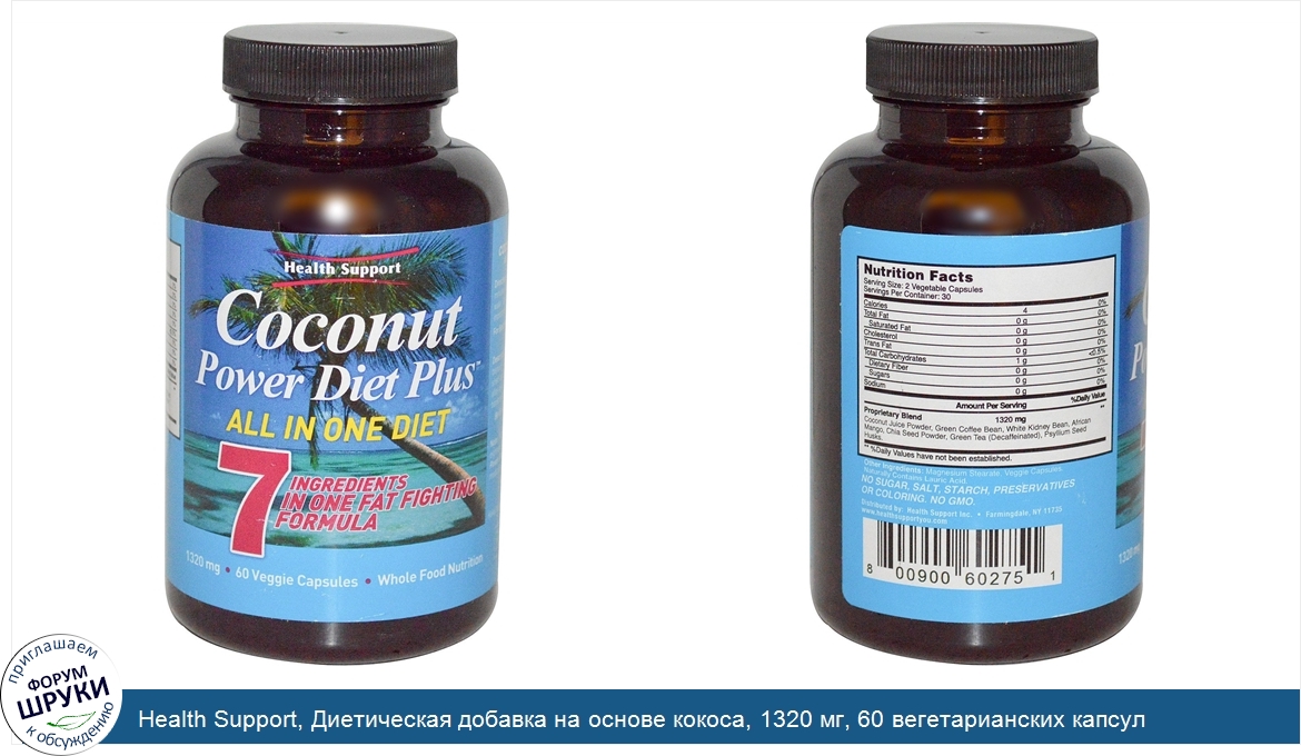 Health Support, Диетическая добавка на основе кокоса, 1320 мг, 60 вегетарианских капсул