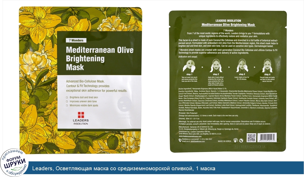 Друзья, если у вас есть отзыв/дополнение/комментарий/вопрос относительно Leaders, Осветляющая маска со средиземноморской оливкой, 1 маска - напишите его ответом в эту тему (это будет полезно всему сообществу в целом и вам в отдельности).