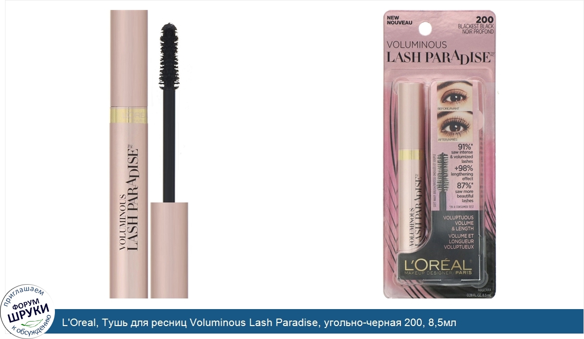 L'Oreal, Тушь для ресниц Voluminous Lash Paradise, угольно-черная 200, 8,5мл