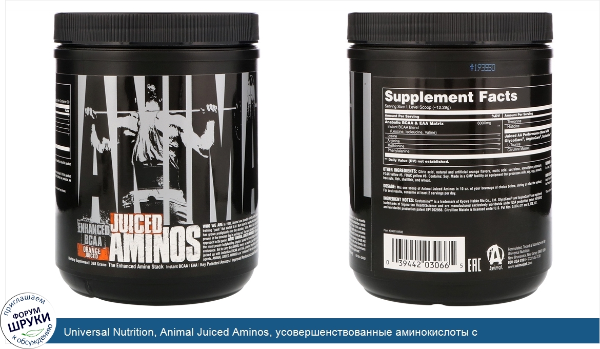 [DESCRIPT]Dietary Supplement. The Enhanced Amino Stack. Instant BCAA. EAA. Key Patented Aminos. Improved Performance and Recovery. Who We Are. In 1983, Animal was founded with the birth of Animal Pak, the venerable training "pack" that started it all. Born from the needs and desires of pro bodybuilders, Animal has grown prodigiously over the decades. Today, Animal has stood the test of time and been proven in the trenches day in and day out. The name stands for trust, integrity and a no nonsense approach to the game. What Animal Juiced Aminos Is. Enhanced. Aminos are among the most proven bodybuilding staples, touted for their ability to improve recovery, strength and endurance. But to carry the Animal name, we couldn't just settle for any old amino formula. All jacked up with instantized BCAA and EAA, patented ingredients and time-tested performance agents, Amino Juiced Aminos is an "enhanced" take on a trusted lifting supplement.[/DESCRIPT]... (описание дополняется)