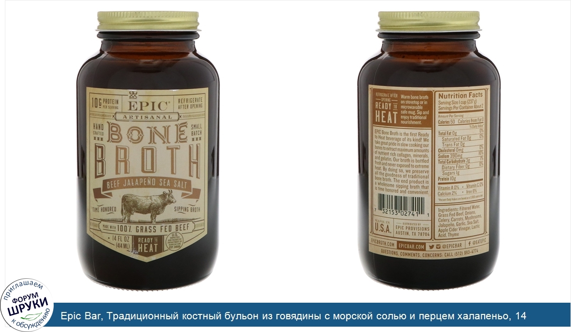 Друзья, если у вас есть отзыв/дополнение/комментарий/вопрос относительно Epic Bar, Традиционный костный бульон из говядины с морской солью и перцем халапеньо, 14 унций (414 мл) - напишите его ответом в эту тему (это будет полезно всему сообществу в целом и вам в отдельности).