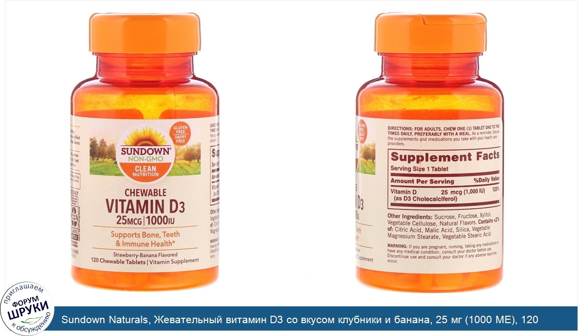 Друзья, если у вас есть отзыв/дополнение/комментарий/вопрос относительно Sundown Naturals, Жевательный витамин D3 со вкусом клубники и банана, 25 мг (1000 МЕ), 120 жевательных таблеток - напишите его ответом в эту тему (это будет полезно всему сообществу в целом и вам в отдельности).