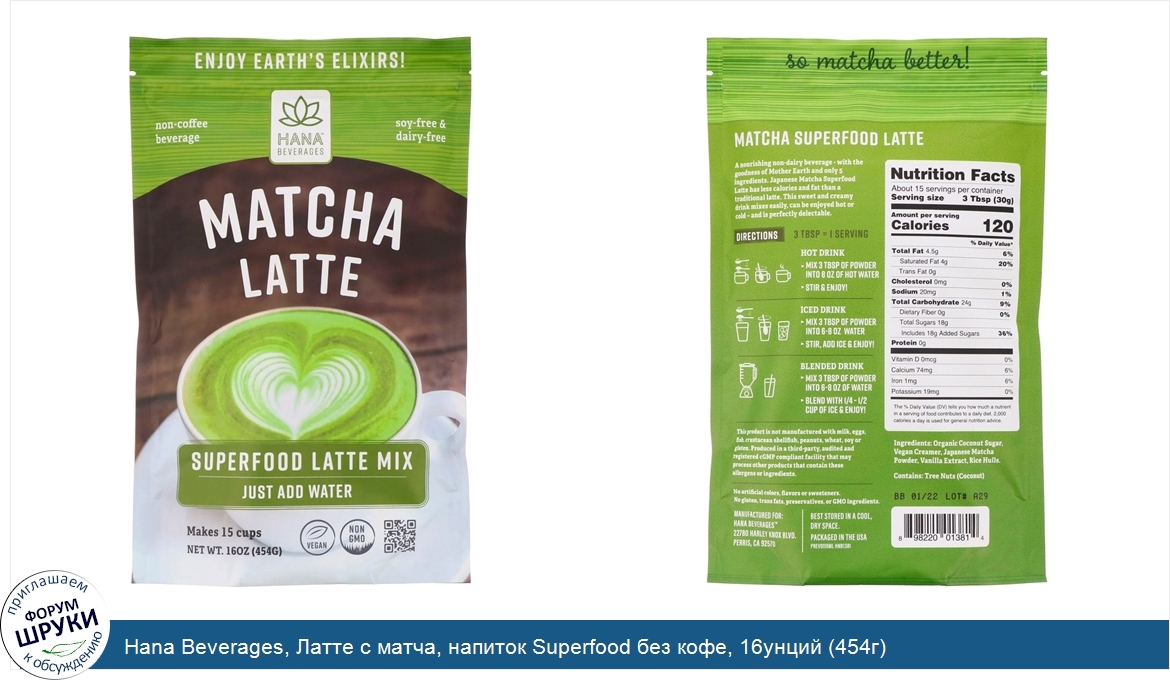 . Hana Beverages. Латте с матча. Смесь Superfood Latte/напиток без кофе. Просто добавьте воды/на 15 чашек. Без сои, без молочных продуктов, веганский продукт. Без ГМО, без глютена и трансжиров. Нет искусственных ...