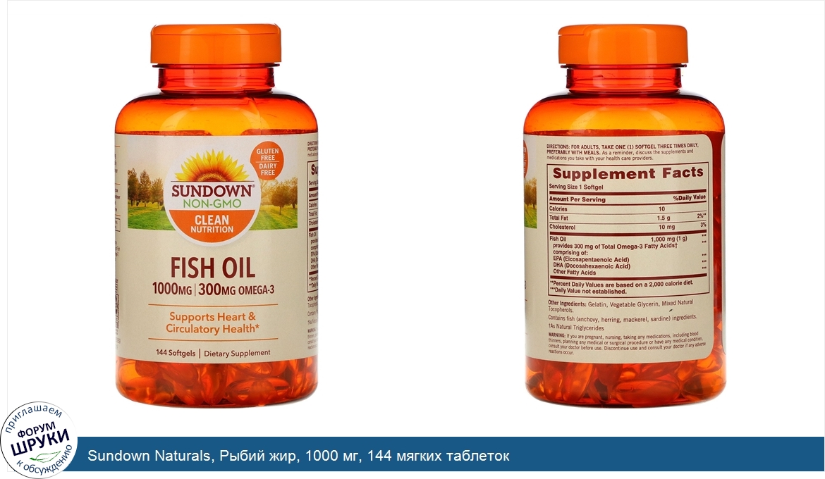 Друзья, если у вас есть отзыв/дополнение/комментарий/вопрос относительно Sundown Naturals, Рыбий жир, 1000 мг, 144 мягких таблеток - напишите его ответом в эту тему (это будет полезно всему сообществу в целом и вам в отдельности).