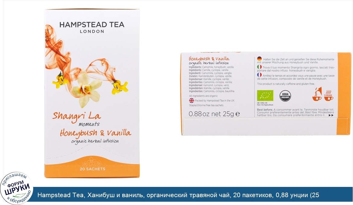 [DESCRIPT]Shangri La Moments. Organic Herbal Infusion. USDA Organic. Hampstead Tea London. At Hampstead Tea our pledge is to support the growing of the finest Organic Teas which revolves around the dual notions of great taste and peace of mind. The Tea is farmed intuitively, responsibly and in tune with nature, always nurturing the purity of the source. This guaranteed by our organic certification. Honeybush Vanilla - Organic Herbal Infusion. Find your Shangrita moments in any day by taking time to indulge in something decadent and smooth. Let our mellow Honeybush with fragrant vanilla take you there whenever you can.[/DESCRIPT]... (описание дополняется)