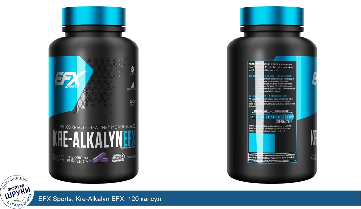 Formulated to Win! Muscle - Performance - Strength. PH-Correct Creatine Monohydrate. Dietary Supplement. Clinically Proven. The Original Purple Cap. Informed Sport - Trusted by Sport. Kre-Alkalyn EFX. It's Buffer...