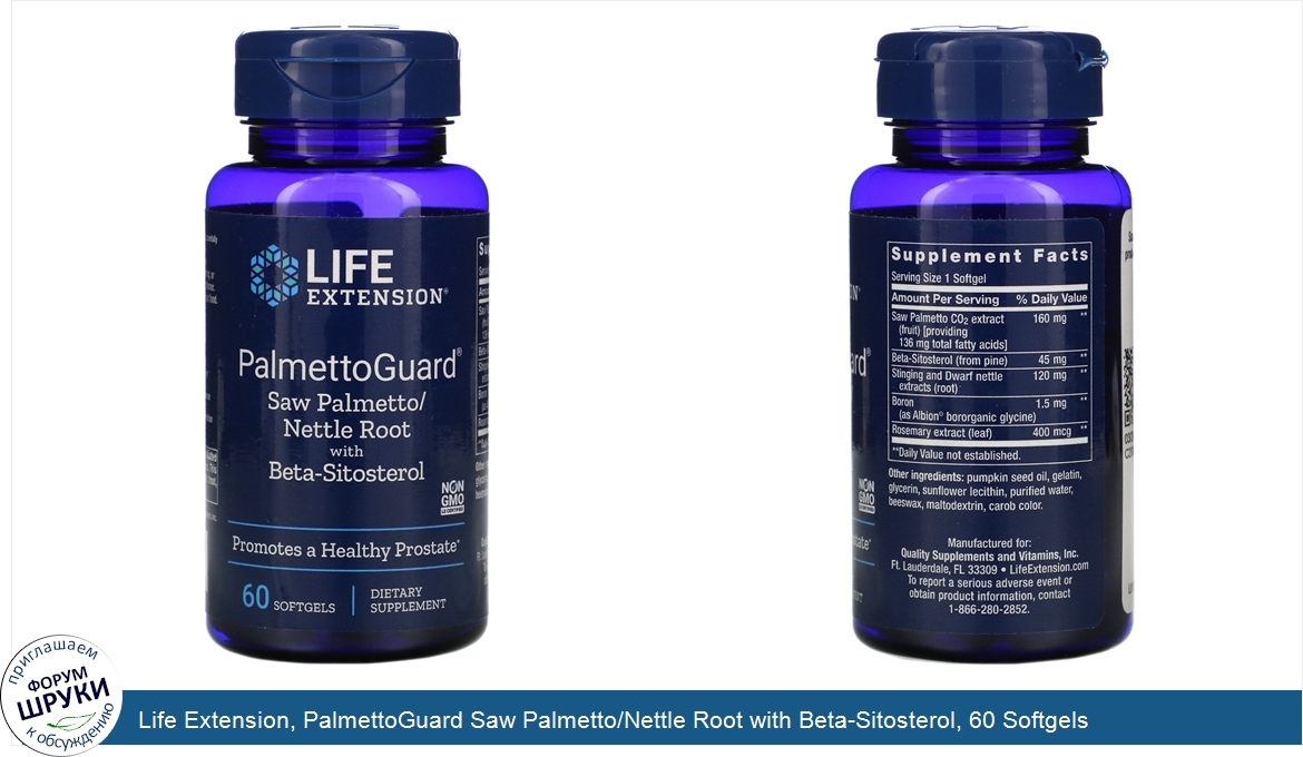 Друзья, если у вас есть отзыв/дополнение/комментарий/вопрос относительно Life Extension, PalmettoGuard Saw Palmetto/Nettle Root with Beta-Sitosterol, 60 Softgels - напишите его ответом в эту тему (это будет полезно всему сообществу в целом и вам в отдельности).