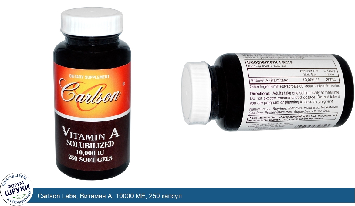 Друзья, если у вас есть отзыв/дополнение/комментарий/вопрос относительно Carlson Labs, Витамин А, 10000 МЕ, 250 капсул - напишите его ответом в эту тему (это будет полезно всему сообществу в целом и вам в отдельности).