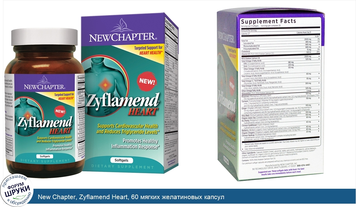 [DESCRIPT]Нацеленная поддержка здоровья сердца. Новинка! . Поддерживает здоровье сердечно-сосудистой системы и снижает уровни триглицеридов. Способствует здоровой противовоспалительной реакции организма. Пищевая добавка. Без ГМО. С диким лососем с Аляски. Целостный продукт. Полностью растительное происхождение. Здоровье всего организма. Естественное отсутствие глютена. Здоровье. Zyflamend от компании New Chapter: передовая растительная формула для здоровой противовоспалительной реакции всего организма. Цель — здоровое сердце. Воспалительные процессы играют критическую роль в здоровье сосудистой системы (кровяные сосуды). Воспаления в сердечно-сосудистой системе — это то, что мы не можем чувствовать, однако здоровая противовоспалительная реакция сердечно-сосудистой системы является критической для здоровья всего организма. Препарат Zyflamend способствует здоровой противовоспалительной реакции организма. Он поддерживает эндотелиальную функцию — способность кровяных сосудов циркулировать кровь по организму. Доказано, что данный препарат снижает уровни триглицеридов и обеспечивает ваш организм элементами, питающими сердце. Кроме того, полезные жирные кислоты ряда омега помогают сбалансировать хорошие жиры и плохие жиры в организме. Отличия компании New Chapter. Наши добавки являются цельнопищевыми, они легко распознаются и поглощаются вашим организмом. Мы не используем агрессивных химических растворителей, предоставляя вам натуральный экстракт трав и суперпродуктов полного спектра. Воспаление сердца. — эта нацеленная формула представляет собой целостный подход к здоровью сердечно-сосудистой системы, помогая поддерживать здоровье кровяных сосудов и сердца, а также общее функционирование сердечно-сосудистой системы. Подкреплено наукой. — доклинические исследования показывают, что травы, входящие в состав препарата Zyflamend heart, способствуют здоровым уровням ключевых антиоксидантов, необходимых для защиты сердечно-сосудистой системы. Поддержка сердечно-сосудистой системы, насыщенная жирными кислотами ряда омега. — все жирные кислоты ряда омега, входящие в состав препарата Zyflamend Heart, проявили себя как такие, что сокращают количество триглицеридов и улучшают индекс омега-3, ключевой маркер здорового сердца. Здоровое питание сердца. — доставляет в ваш организм эквивалент жирных кислот ряда омега трех порций дикого лосося с Аляски в неделю† и ежедневно эквивалент резвератрола, содержащегося в шести бокалах вина. Растительная добавка №1 по продажам. ‡ — Включает в себя запатентованную формулу Zyflamend, которая, как доказано в лабораторных условиях, оказывает благоприятное воздействие на здоровье сердца плюс на весь организм, в частности на здоровье суставов и иммунной системы. † 2 грамма рыбьего жира Wholemega в дневной дозе. ‡ В соответствии с исследованием рынка, проведенным SPINS в 2011 году.[/DESCRIPT]... (описание дополняется)