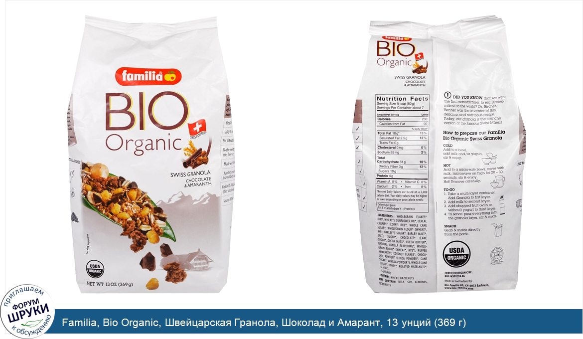 [DESCRIPT]Swiss Quality. USDA Organic. Certified Organic by: Bio. Inspecta AG. Genuine Swiss! From the organic pioneer Bio-Familia in the heart of Switzerland here is our taste sustainability promise:. Real Swiss Chocolate. 100% selected organic ingredients. No GMO's. Made with 22 g of Whole Grains per Serving. Made with Ancient Grains. A perfect snack or quick meal for breakfast, lunch or dinner. Made with 100% green power and other sustainable production methods. Source of Fiber, low Sodium. Grüezi and welcome to Familia! We are a family held company and have been producing authentic Swiss cereals since 1954. Together with Dr. Hans Miller, we pioneered organic farming back in the late fifties. We know out future needs to be green and one of our many contributions to the environment is using the finest, organically grown ingredients. These high quality ingredients are produced using eco friendly methods to make this unmatched, tasty Granola! Be part of our green family! Enjoy this slow baked Granola- and with every spoon, you'll get the Swiss feeling of being high in the alps overlooking the pristine landscapes. This Bag Is Full of Natural Goodness We Love:. Whole Grains. The protein of Amaranth. The Hearty Flavor of Roasted Nuts. The Smoothness of Coconut Flakes. The Pure Kosher quality with a Swiss Chocolate crunch! ! Did You Know. that we were the first manufacturer to sell Bircher-muesli to the world? Dr. Bircher-Benner was the inventor of this delicious and nutritious recipe. Today, our granola is the crunchy version of the famous Swiss Muesli![/DESCRIPT]... (описание дополняется)