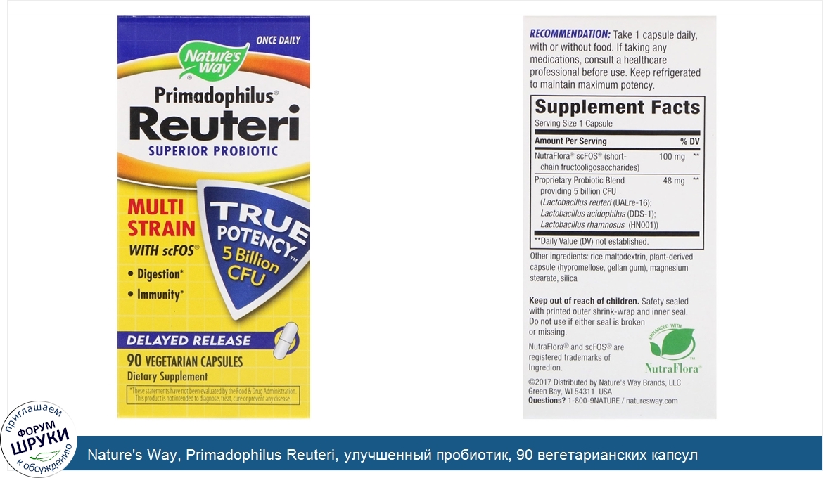 [DESCRIPT]Принимать один раз в день. Полиштамм с scFOS®. Поддерживает пищеварение. Укрепляет иммунитет. TRUE POTENCY™ — 5 млрд КОЕ. Продленного действия. Пищевая добавка. Содержит пребиотик NutraFlora®. Пищеварение и иммунитет. Преимущества PRIMADOPHILUS® Reuteri. PRIMADOPHILUS® Reuteri — пробиотик с полиштаммовой формулой L. reuteri (UALre-16), L. acidophilus и L. rhamnosus, который может помочь:. Поддерживать здоровье иммунной системы. Способствовать здоровому пищеварению. Что такое Reuteri? Lactobacillus reuteri представляет собой уникальный пробиотический штамм, который заселяет кишечник, помогая поддерживать баланс пищеварения и укреплять иммунную систему. Улучшенный пробиотик. Primadophilus Reuteri укрепляет желудочно-кишечный тракт с помощью активных культур лактобактерий. 5 млрд КОЕ на порцию. Полиштаммовая формула с L. reuteri (UALre-16), L. acidophilus и L. rhamnosus. Капсулы с отсроченным высвобождением лекарственного вещества противостоят воздействию желудочного сока, помогая доставлять пробиотики в кишечник. Пребиотик с NutraFlora® scFOS® (короткоцепочечные фруктоолигосахариды) для поддержки роста пробиотических бактерий. TRUE POTENCY GUARANTEE™. PRIMADOPHILUS® Reuteri содержит не менее 5 млрд КОЕ до истечения срока годности, указанного на этой упаковке. Большинство других брендов пробиотиков заявляют о своей эффективности на момент изготовления.[/DESCRIPT]... (описание дополняется)