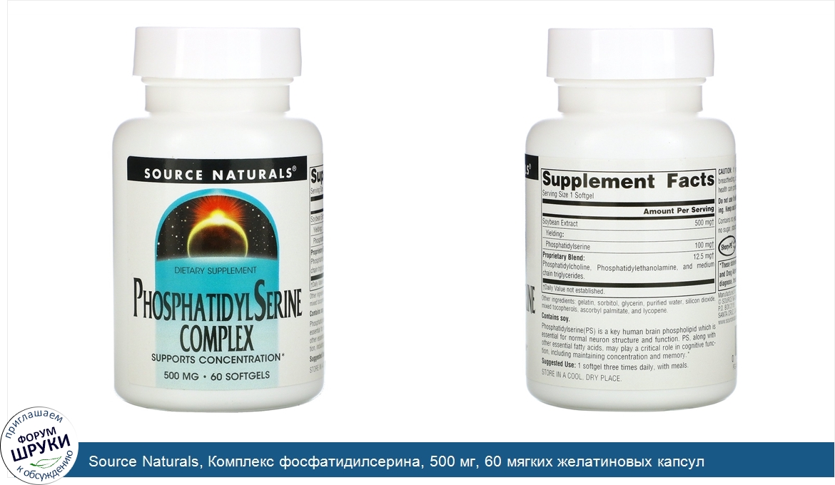 Друзья, если у вас есть отзыв/дополнение/комментарий/вопрос относительно Source Naturals, Комплекс фосфатидилсерина, 500 мг, 60 мягких желатиновых капсул - напишите его ответом в эту тему (это будет полезно всему сообществу в целом и вам в отдельности).