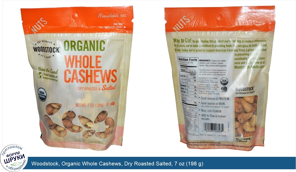 ru Woodstock, Organic Whole Cashews, Dry Roasted Salted, 7 oz (198 g)