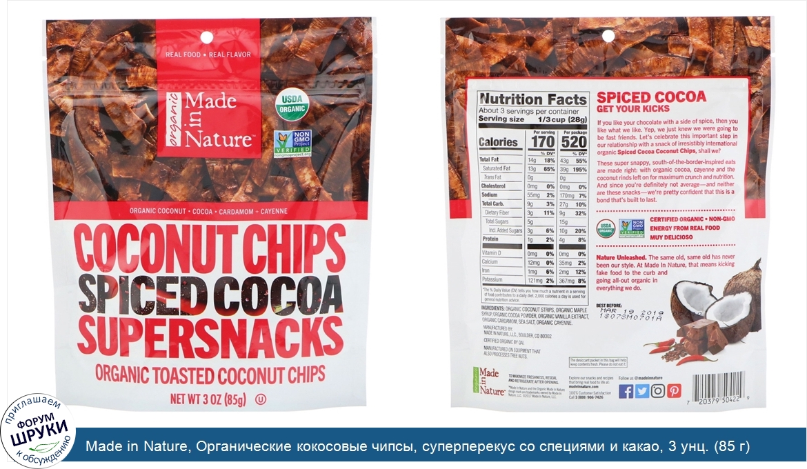 Друзья, если у вас есть отзыв/дополнение/комментарий/вопрос относительно Made in Nature, Органические кокосовые чипсы, суперперекус со специями и какао, 3 унц. (85 г) - напишите его ответом в эту тему (это будет полезно всему сообществу в целом и вам в отдельности).