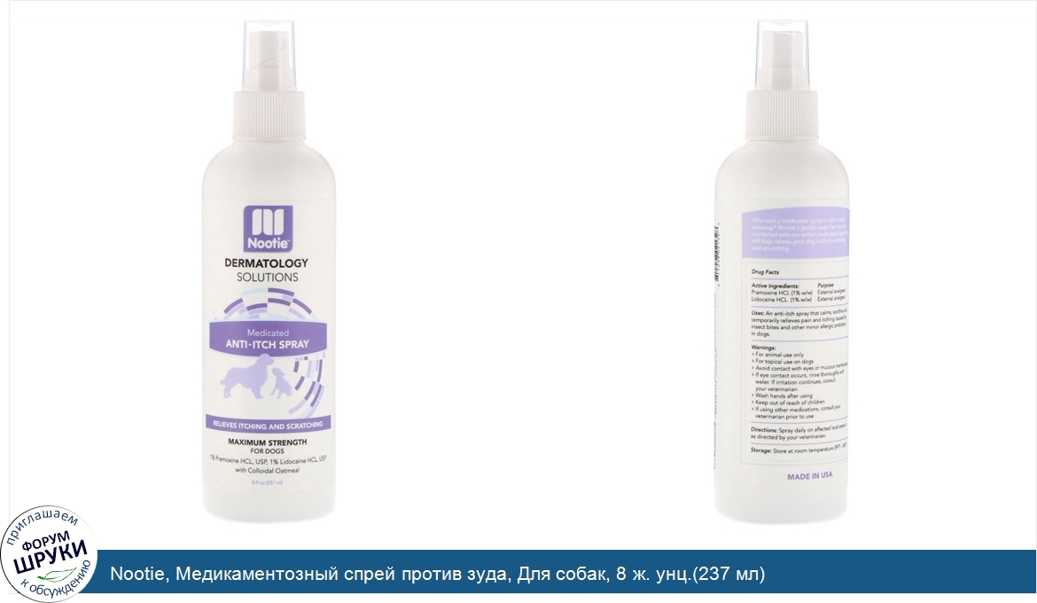 Друзья, если у вас есть отзыв/дополнение/комментарий/вопрос относительно Nootie, Медикаментозный спрей против зуда, Для собак, 8 ж. унц.(237 мл) - напишите его ответом в эту тему (это будет полезно всему сообществу в целом и вам в отдельности).