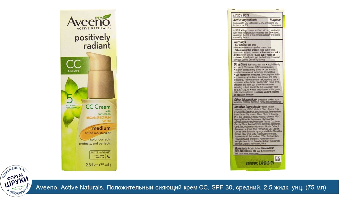 Друзья, если у вас есть отзыв/дополнение/комментарий/вопрос относительно Aveeno, Active Naturals, Положительный сияющий крем CC, SPF 30, средний, 2,5 жидк. унц. (75 мл) - напишите его ответом в эту тему (это будет полезно всему сообществу в целом и вам в отдельности).
