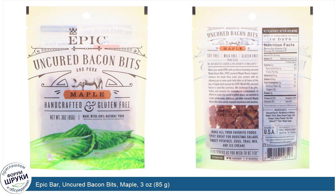 [DESCRIPT]Uncured Bacon Bits and Pork. Handcrafted Gluten Free. Made With 100% Natural* Pork. U.S. Inspected and Passed by Department of Agriculture. Soy Free. Milk Free. Gluten Free. Pork Used. No Antibiotics Added No Growth Stimulants**. Feed Other As You Wish to Be Fed. Make your meals EPIC with our flavor boosting uncured Maple Bacon Bits. EPIC uncured Maple Bacon toppers enhance the foods they come into contact with by allowing you to enter pork belly bliss at all time of the day. A staple food around the EPIC World HQ, uncured bacon is used like currency. We exchange it as gifts, bribes, and rewards for monumental achievement. In efforts to make this world a better place, we worked to create wholesome, delicious, portable uncured Maple Bacon Bits that can be enjoyed anywhere and anytime. *Minimally processed. No artificial ingredients. **Federal regulations prohibit the use of growth stimulants in pork.[/DESCRIPT]... (описание дополняется)