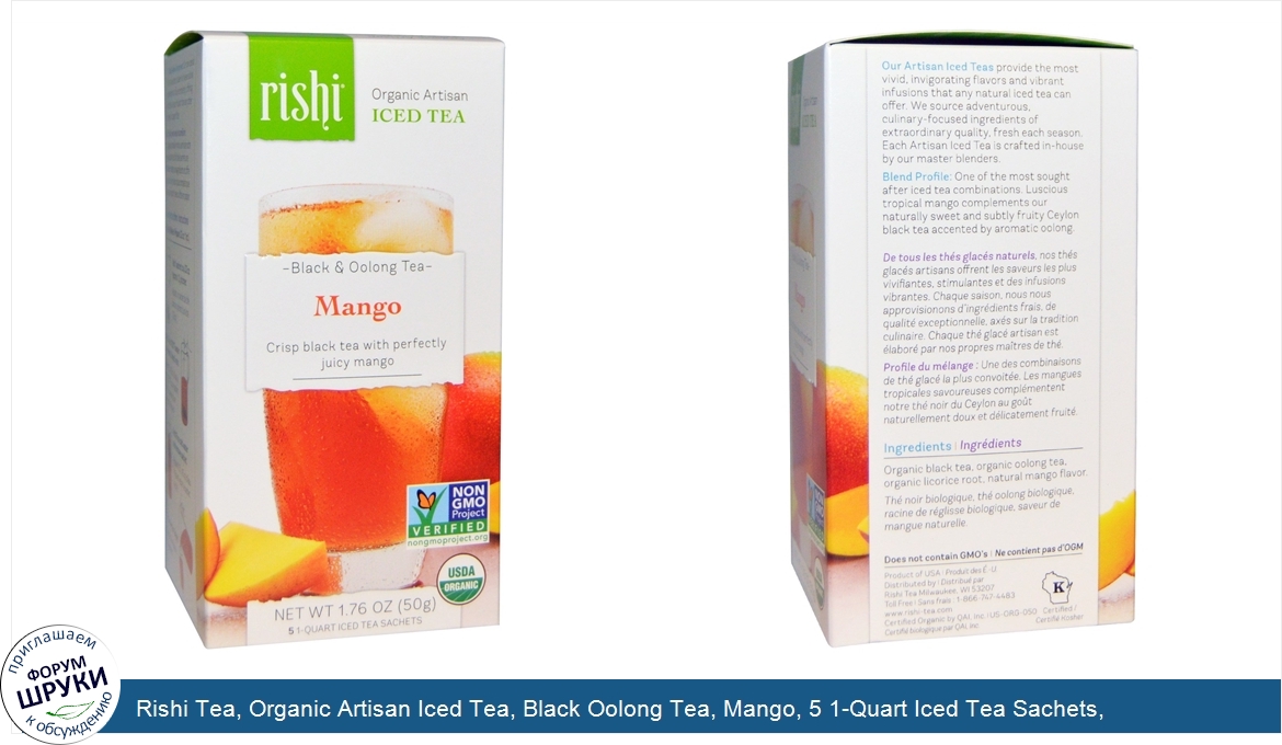 Rishi Tea, Organic Artisan Iced Tea, Black Oolong Tea, Mango, 5 1-Quart Iced Tea Sachets, 1.76 oz (50 g)