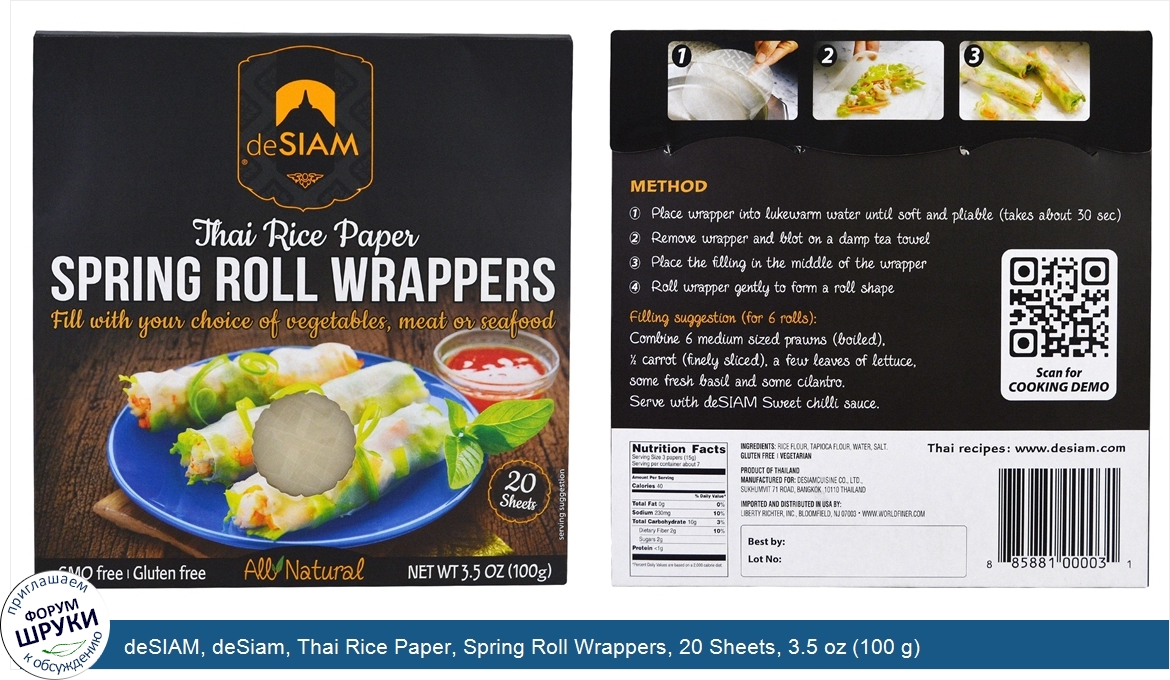 Друзья, если у вас есть отзыв/дополнение/комментарий/вопрос относительно deSIAM, deSiam, Thai Rice Paper, Spring Roll Wrappers, 20 Sheets, 3.5 oz (100 g) - напишите его ответом в эту тему (это будет полезно всему сообществу в целом и вам в отдельности).