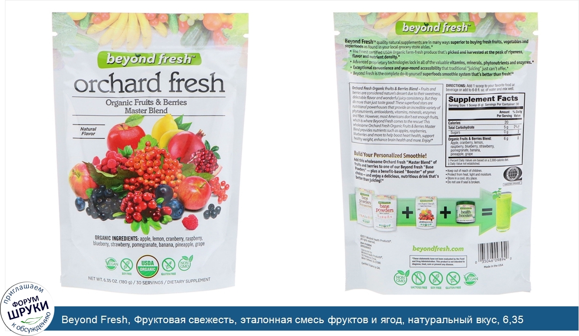 [DESCRIPT]Vegan. Soy Free. USDA Organic. Gluten Free. Non GMO. 30 Servings. Dietary Supplement. Lactose Free. Certified Organic by QAI - Quality Assurance International. Beyond Fresh quality natural supplements are in many ways superior to buying fresh fruits, vegetables and superfoods as found in your local grocery store aisle. The finest certified USDA Organic farm-fresh produce that's picked and harvested at the peak of ripeness, mouth-watering flavor and nutrient density. Advanced proprietary technologies lock in all of the valuable vitamins, minerals, phytonutrients and enzymes. Exceptional convenience and year-round accessibility that traditional "juicing" just can't offer. Beyond Fresh is the complete do-it-yourself superfoods smoothie system that's better than fresh! Orchard Fresh Organic Fruits Berries Blend. - Fruits and berries are considered nature's dessert due to their sweetness, delectable flavor and wonderful juicy consistency. But they do more than just taste good! These superfood stars are nutritional powerhouses that provide an incredible variety of phytonutrients, antioxidants, vitamins, minerals, enzymes and fiber. However, most Americans don't eat enough fruits, which is where Beyond Fresh comes to the rescue! This wholesome Orchard Fresh Organic Fruits Berries Master Blend provides nutrients such as apples, raspberries, blueberries and more to help boost heart health, support healthy weight, enhance brain health and more. Enjoy![/DESCRIPT]... (описание дополняется)