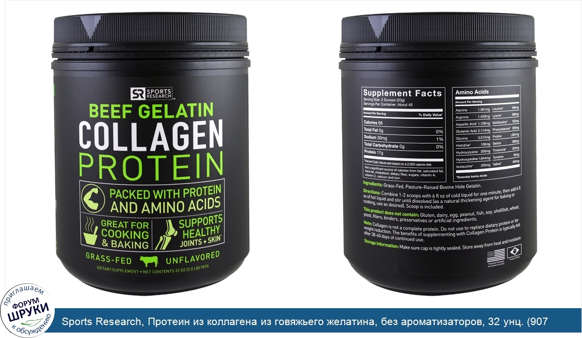 Друзья, если у вас есть отзыв/дополнение/комментарий/вопрос относительно Sports Research, Протеин из коллагена из говяжьего желатина, без ароматизаторов, 32 унц. (907 г) - напишите его ответом в эту тему (это будет полезно всему сообществу в целом и вам в отдельности).