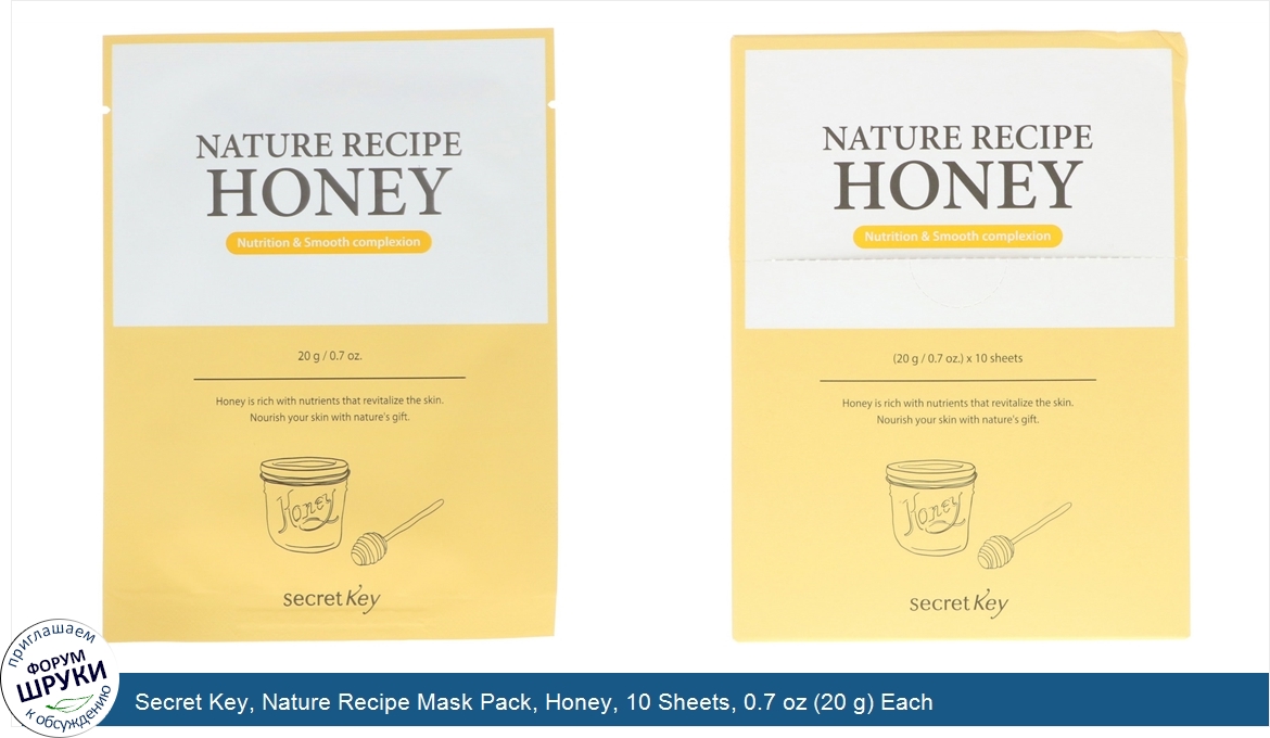 Друзья, если у вас есть отзыв/дополнение/комментарий/вопрос относительно Secret Key, Nature Recipe Mask Pack, Honey, 10 Sheets, 0.7 oz (20 g) Each - напишите его ответом в эту тему (это будет полезно всему сообществу в целом и вам в отдельности).