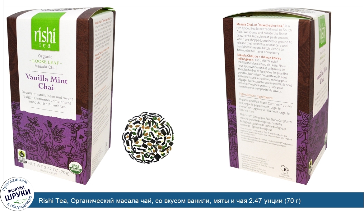 Друзья, если у вас есть отзыв/дополнение/комментарий/вопрос относительно Rishi Tea, Органический масала чай, со вкусом ванили, мяты и чая 2.47 унции (70 г) - напишите его ответом в эту тему (это будет полезно всему сообществу в целом и вам в отдельности).