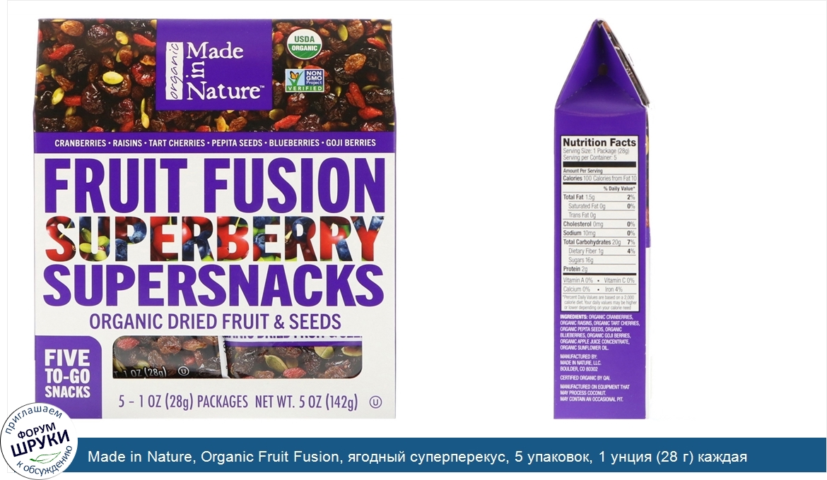 [DESCRIPT]Натуральные сушеные фрукты и семена. Органическое происхождение подтверждено Министерством сельского хозяйства США. Подтверждено отсутствие ГМО . Клюква - Изюм - Вишня - Тыквенные семена - Черника - Ягоды годжи. Пять упаковок для перекуса на ходу. Кошерный продукт. Без сульфатов. Чрезвычайно вкусно. Изготовлено природой. Сертифицированный органический продукт, гарантированное качество. Superberry Fruit Fusion - зарядите каждый укус. Некоторые вкусы просто астрономические.космически неотразимые.не от мира сего просто невозможно поверить, что они родились в нашей галактике. К счастью для человечества, они все-таки созданы здесь. От органических вишен, черники и ягод годжи до изюма, клюквы и хрустящих тыквенных семян, многие из мощнейших фруктов и вкусов планеты объединились в Superberry Fruit Fusion. Хотите сладкого? POW! Это ваше. Вы хотите терпкости? ВОТ! Готово. Хотите перекус, будто бы созданный самой матерью природой? БУМ! Сей звездный купаж над сим. Сила природы: мы никогда не придерживались подхода "старый друг лучше новых двух". Мы в компании Made in Nature полностью отказались от рафинированного сахара и работаем в "органическом режиме" касательно всего, что мы делаем. В Made in Nature реальные продукты всегда побеждают. В этом вопросе мы никогда не испытывали сомнений - только честные органические ингредиенты, доказывающие, насколько хорошо природа знает свое дело. И наши Fruit Fusion Supersnacks — не исключение. В них сочные фрукты идеально сочетаются с потрясающими дополнительными ингредиентами, чтобы сделать эти закуски такими, какие они и есть в природе: вкусными, натуральными и именно такими, как и задумано природой.[/DESCRIPT]... (описание дополняется)