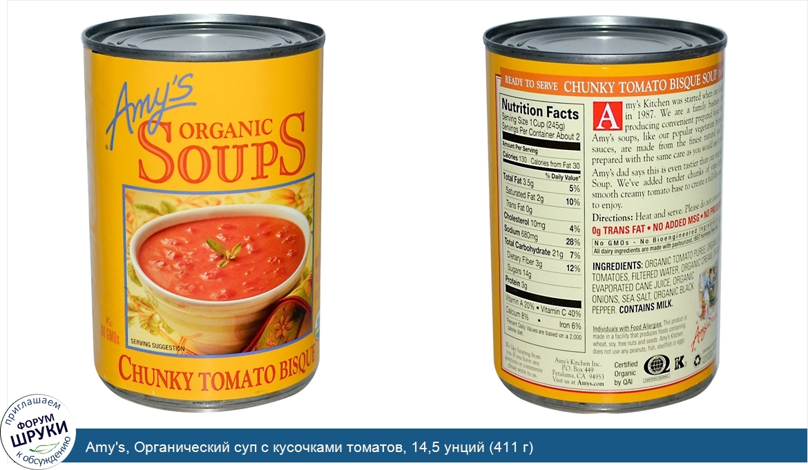 Друзья, если у вас есть отзыв/дополнение/комментарий/вопрос относительно Amy's, Органический суп с кусочками томатов, 14,5 унций (411 г) - напишите его ответом в эту тему (это будет полезно всему сообществу в целом и вам в отдельности).