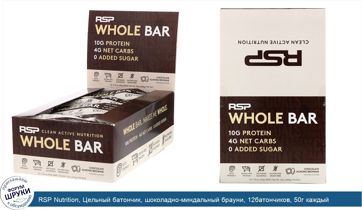 RSP Nutrition, Цельный батончик, шоколадно-миндальный брауни, 12батончиков, 50г каждый