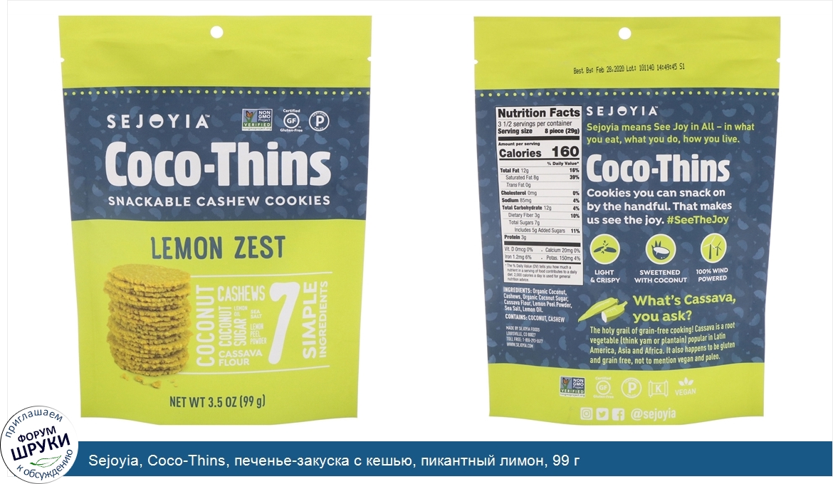 Друзья, если у вас есть отзыв/дополнение/комментарий/вопрос относительно Sejoyia, Coco-Thins, печенье-закуска с кешью, пикантный лимон, 99 г - напишите его ответом в эту тему (это будет полезно всему сообществу в целом и вам в отдельности).