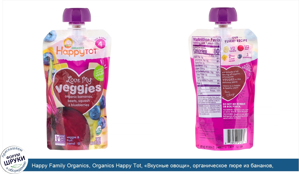 Друзья, если у вас есть отзыв/дополнение/комментарий/вопрос относительно Happy Family Organics, Organics Happy Tot, «Вкусные овощи», органическое пюре из бананов, свеклы, тыквы и голубики, 120г - напишите его ответом в эту тему (это будет полезно всему сообществу в целом и вам в отдельности).