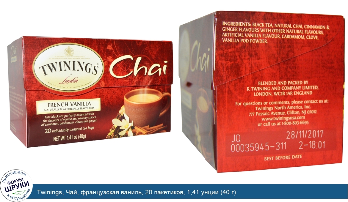 [DESCRIPT]Naturally Artificially Flavored. 20 Individually Wrapped Tea Bags. Kosher. Fine black tea perfectly balanced with the flavors of vanilla and savory spices of cinnamon, cardamon, cloves and ginger. The finest black tea expertly blended with the enticing flavor of sweet vanilla and the savory spice flavors of cinnamon, cardamom, cloves and ginger to deliver a delicious tea with a warm, soothing aroma and smooth, creamy taste. Chai Smoothing, Spicy Aromatic. For over 300 years, Twinings has been sourcing and blending the finest, high-quality teas from around the glove to ensure that your tea has the perfect balance of tea taste, flavor and aroma. Twinings blends to perfection the finest black teas with the sweet and savoury spice flavors of cinnamon, cardamom, cloves and ginger to give you a line of great-tasting Chai teas with a bold, spicy taste and rich, vibrant aroma. The Twinings Story. In 1706 Thomas Twining began selling fine tea from an English storefront in The Strand, London. Today, Twinings still sells some of the world’s best teas from the original store and in more than 100 countries throughout the world.[/DESCRIPT]... (описание дополняется)