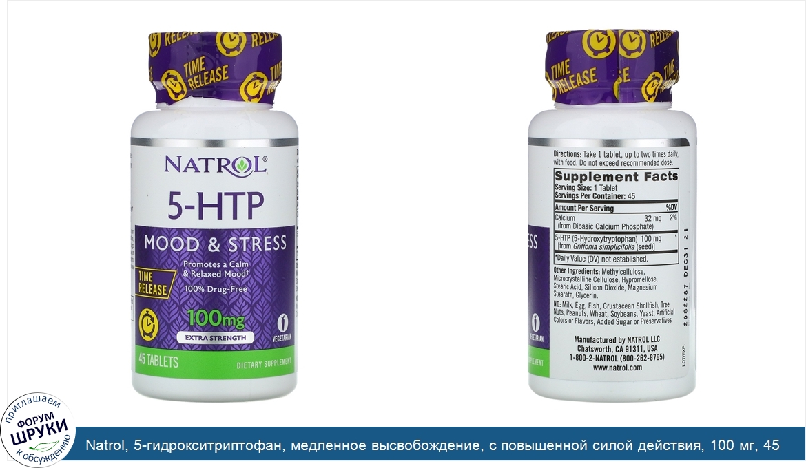 Друзья, если у вас есть отзыв/дополнение/комментарий/вопрос относительно Natrol, 5-гидрокситриптофан, медленное высвобождение, с повышенной силой действия, 100 мг, 45 таблеток - напишите его ответом в эту тему (это будет полезно всему сообществу в целом и вам в отдельности).