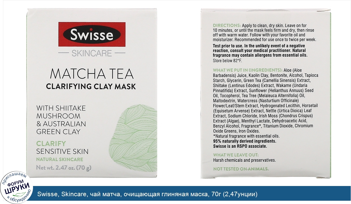 Друзья, если у вас есть отзыв/дополнение/комментарий/вопрос относительно Swisse, Skincare, чай матча, очищающая глиняная маска, 70г (2,47унции) - напишите его ответом в эту тему (это будет полезно всему сообществу в целом и вам в отдельности).