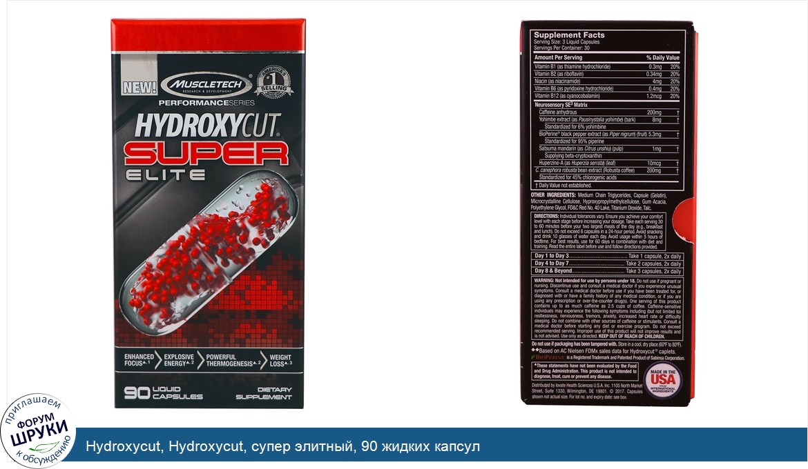 [DESCRIPT]Самый популярный в Америке бренд продуктов для снижения веса. Серия Performance. Повышенная концентрация¹. Эксплозивная энергия². Мощный термогенез². Снижение веса³. Пищевая добавка. Микрогранулы с "умным" высвобождением. Супер премиальное средство, симулирующее снижение веса. Нейросенсорная SE³ матрица. Экстремальный сенсорный эффект. Hydroxycut Super Elite сочетает тщательно подобранные дозировки ингредиентов, включая японский мандарин, содержащий бета-криптоксанин, гуперзин А и йохимбе. Эта уникальная формула обеспечивает невероятный сенсорный эффект, который вы больше нигде не найдете. Повышенная концентрация. ¹Эта тщательно проработанная формула содержит мощную дозу молекул кофеина для обеспечения улучшенной концентрации. Эксплозивная энергия и мощный термогенез. ²Каждая порция содержит безводный кофеин для стимуляции эффективности тренировки и заряда энергии, когда вам это необходимо, запуская процесс интенсивного термогенеза. Усиление метаболической энергии. Продвинутая смесь ингредиентов также содержит витамины группы В, которые поддерживают метаболизм макроэлементов - преобразование жиров, углеводов и протеинов в метаболическую энергию. Научно подтвержденное снижение веса. Hydroxycut Super Elite содержит ультра-премиальный ингредиент - C. canephora robusta. Этот ключевой ингредент доказал свою эффективность в ходе двух исследований с участием людей с подтвержденными результатами снижения веса! ³. В ходе одного исследования участники принимали основной ингредиент (C. canephora robusta) Hydroxycut Super Elite в течение 60 дней и потеряли в среднем 5 кг, в то время как принимавшие плацебо потеряли всего 2,45 кг. Обе участвовавшие в исследовании группы придерживались низкокалорийной диеты. В другом 8-недельном исследовании испытуемые, принимавшие тот же ингредиент, потеряли в среднем 1,7 кг в отличие от принимавших плацебо, которые в среднем потеряли 0,57 кг. Обе группы в этом случае придерживались диеты со сниженным количеством калорий и выполняли средний объем физической нагрузки. Высочайшая энергичность, повышенная концентрация и интенсивный термогенез. В течение более 20 лет название Hydroxycut служит синонимом результата - именно по этой причине этот бренд является самым популярным брендом продуктов для снижения веса в Америке.♦♦ Сегодня мы представляем новое поколение продуктов для похудения - Hydroxycut Super Elite! Hydroxycut Super Elite содержит новую комбинацию японского мандарина (содержащего бета-криптоксантин) и гуперзин А и предназначен для обеспечения выдающегося сенсорного эффекта. ¹,²Hydroxycut Super Elite также содержит точные дозировки научно исследованного обезвоженного кофеина (C8H10N4O2) для обеспечения взрывной энергии и повышения концентрации и термогенеза. Всего одной дозировки достаточно для мощного прилива энергии, которая поможет вам тренироваться с высокой интенсивностью. Вы можете быть уверены, что Hydroxycut Super Elite предоставит вам все необходимое для получения тела, которое вы всегда желаете. Микрогранулы с "умным" высвобождением. Каждая мощная формула Hydroxycut Super Elite содержит новейшую и самую современную систему доставки. Технология микрогранул с "умным" высвобождением использует самые последние достижения науки для инкапсулирования активных ингредиентов и растворения их в быстрорастворяющемся жидком составе. Эта мощная формула часами снабжает организ