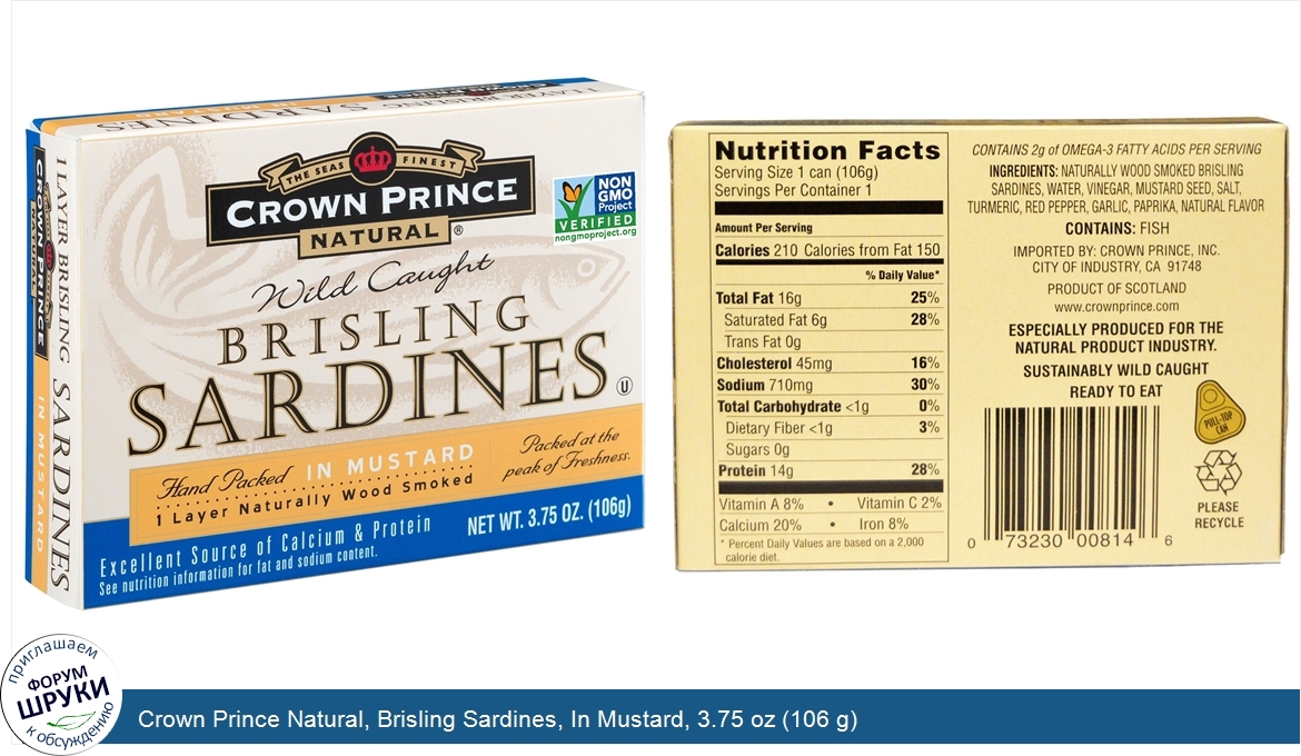 Друзья, если у вас есть отзыв/дополнение/комментарий/вопрос относительно Crown Prince Natural, Brisling Sardines, In Mustard, 3.75 oz (106 g) - напишите его ответом в эту тему (это будет полезно всему сообществу в целом и вам в отдельности).