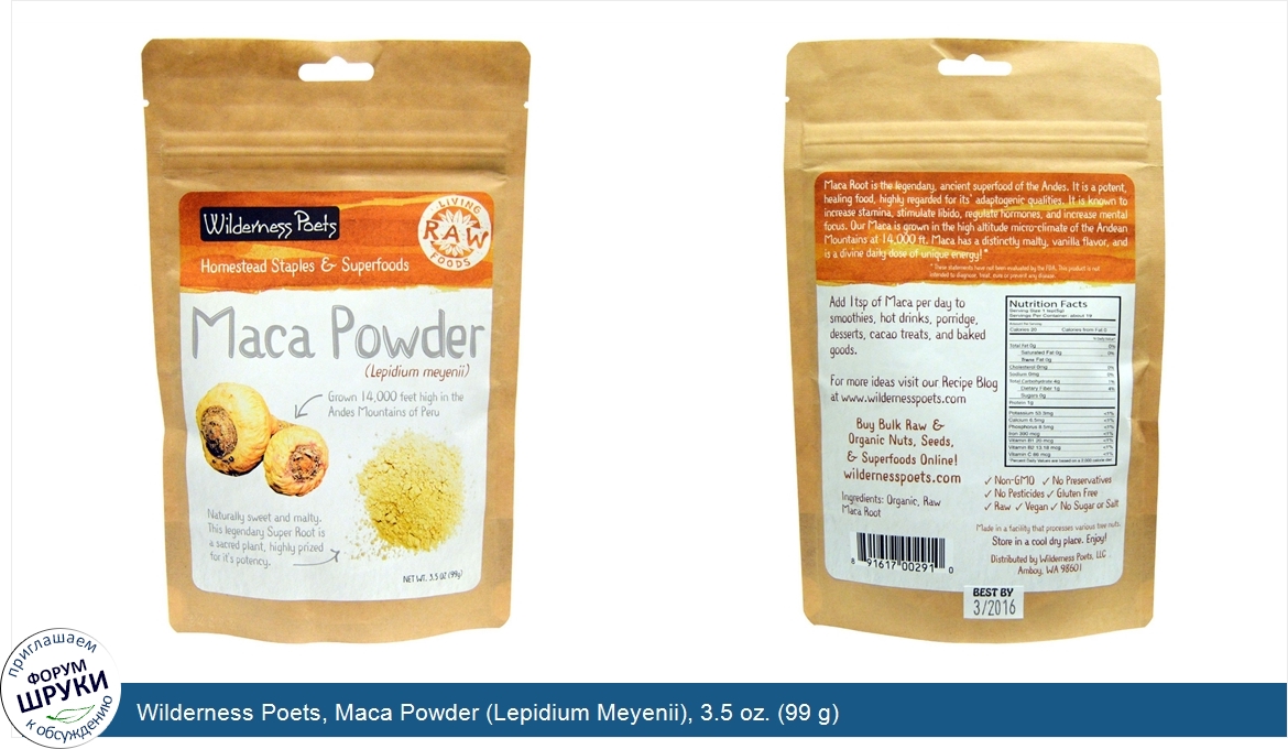 Друзья, если у вас есть отзыв/дополнение/комментарий/вопрос относительно Wilderness Poets, Maca Powder (Lepidium Meyenii), 3.5 oz. (99 g) - напишите его ответом в эту тему (это будет полезно всему сообществу в целом и вам в отдельности).