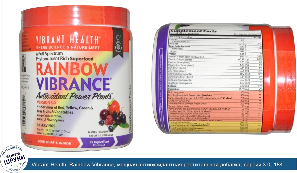 Друзья, если у вас есть отзыв/дополнение/комментарий/вопрос относительно Vibrant Health, Rainbow Vibrance, мощная антиоксидантная растительная добавка, версия 3.0, 184.33 г - напишите его ответом в эту тему (это будет полезно всему сообществу в целом и вам в отдельности).