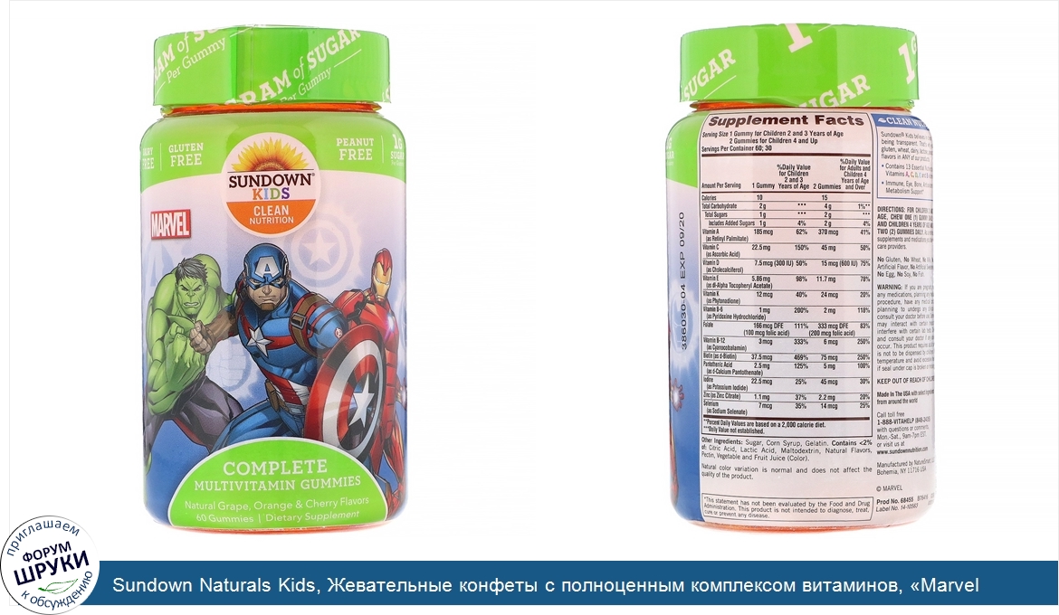Друзья, если у вас есть отзыв/дополнение/комментарий/вопрос относительно Sundown Naturals Kids, Жевательные конфеты с полноценным комплексом витаминов, «Marvel Avengers», натуральные ароматизаторы со вкусом винограда, апельсина и вишни, 60жевательных конфет - напишите его ответом в эту тему (это будет полезно всему сообществу в целом и вам в отдельности).