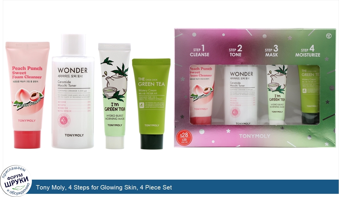 Друзья, если у вас есть отзыв/дополнение/комментарий/вопрос относительно Tony Moly, 4 Steps for Glowing Skin, 4 Piece Set - напишите его ответом в эту тему (это будет полезно всему сообществу в целом и вам в отдельности).