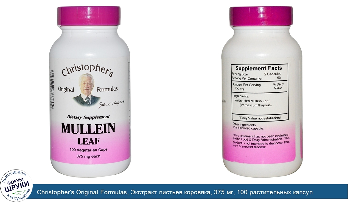 Друзья, если у вас есть отзыв/дополнение/комментарий/вопрос относительно Christopher's Original Formulas, Экстракт листьев коровяка, 375 мг, 100 растительных капсул - напишите его ответом в эту тему (это будет полезно всему сообществу в целом и вам в отдельности).