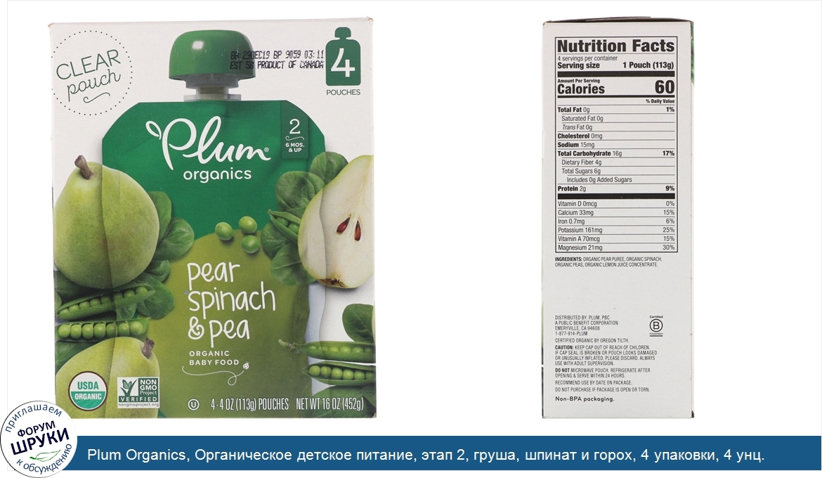 [DESCRIPT]6 Mos. Up. Clear Pouch. USDA Organic. Non GMO Project Verified. Kosher. Certified B Corporation. Certified Organic by Oregon Tilth. Non-BPA Packaging. Plum. We're Team Parent. Why Plum? We're a brand by parents, for parents. And when it comes to feeding your little one, we've got you covered with:. Culinary-inspired blends that train tiny tastes buds. Certified organic, non-GMO ingredients. A brand that gives back to little ones in need (thank you!). Our recipe has about:. 1/2 Pear. 1/2 Spinach. 4 tsp Peas.[/DESCRIPT]... (описание дополняется)