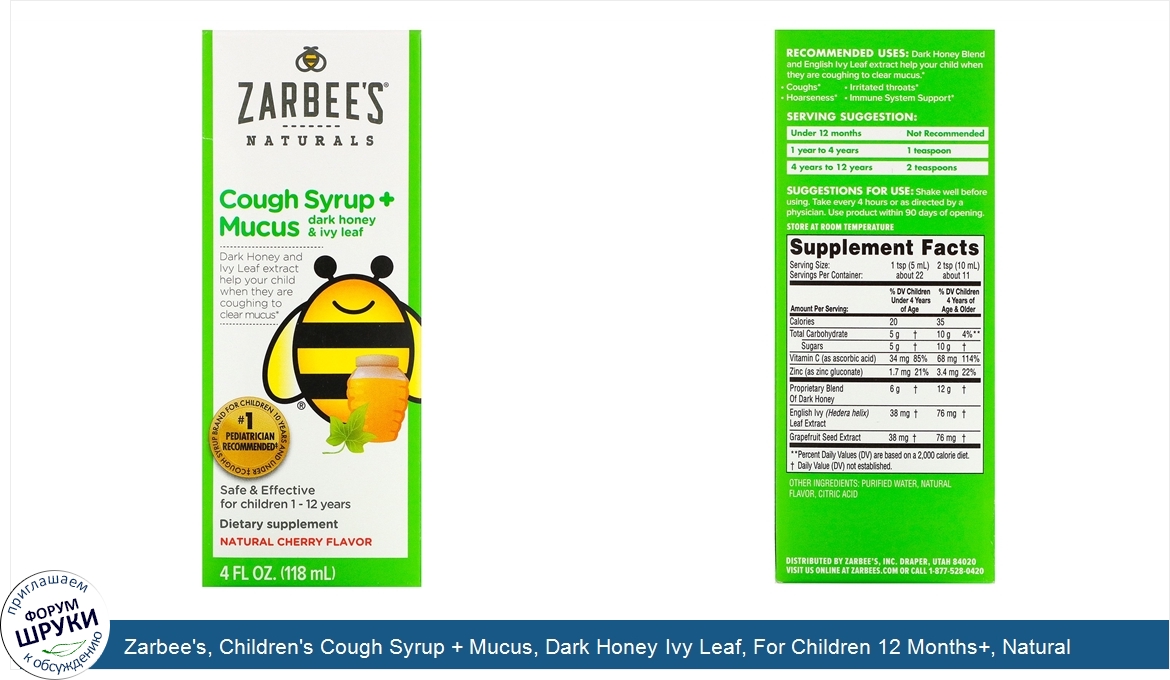 Друзья, если у вас есть отзыв/дополнение/комментарий/вопрос относительно Zarbee's, Children's Cough Syrup + Mucus, Dark Honey Ivy Leaf, For Children 12 Months+, Natural Cherry Flavor, 4 fl oz (118 ml) - напишите его ответом в эту тему (это будет полезно всему сообществу в целом и вам в отдельности).